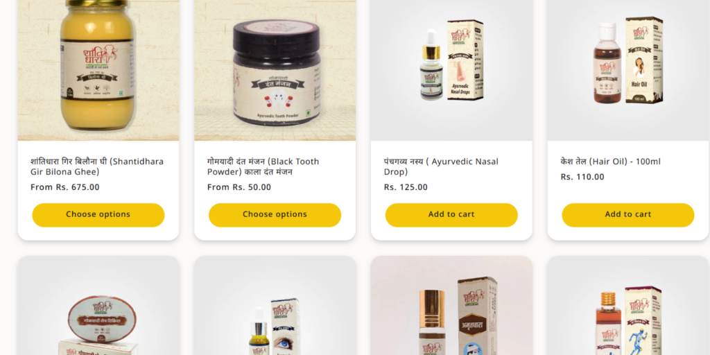 - पंचगव्य औषधियाँ (नस्य तेल, नेत्र अमृत, अर्जुन घृत)